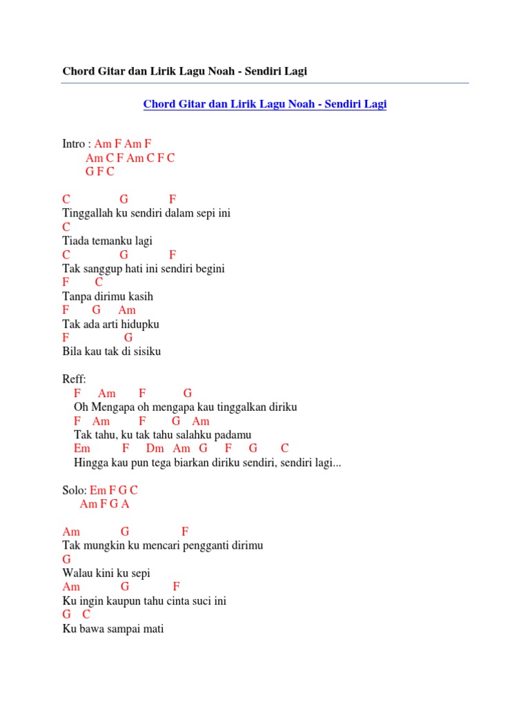 Kunci Gitar Dan Lirik Lagu Noah Sendiri